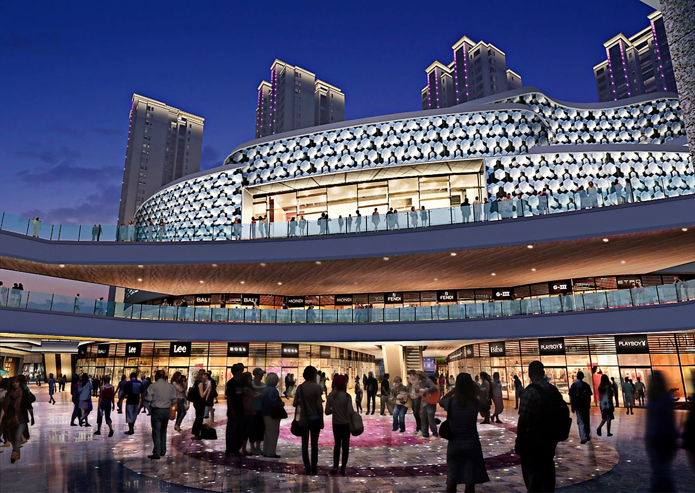 金地仟百汇集开放式休闲商业街区与高端住宅于一体。项目核心楼立面安装特制星钻灯(Diamond Lamps),白天做为建筑幕墙挂件,夜间通过光影渲染,呈现星钻闪耀,在完成常规建筑泛光的基础上,突破完成幕墙装饰与灯具结合,成为国内首屈一指的照明崭新模式。